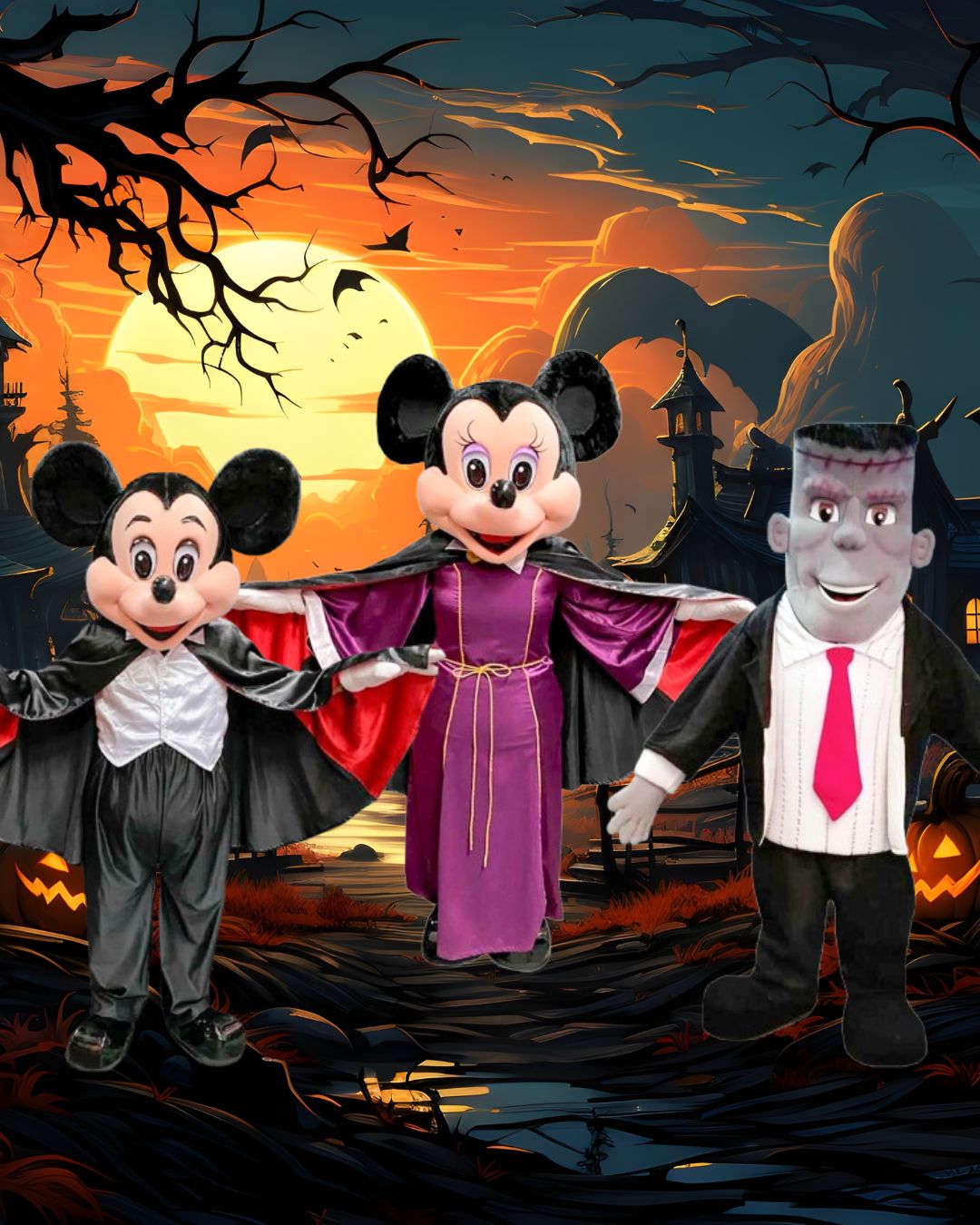 Pair Vampire Mickey with Minnie for the ultimate Halloween duo. Realistic and fun, these mascots are sure to impress at any event.